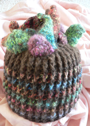 Rainbow hat of two strands natually dyed wool/alpaca yarn. The yarn was dyed in a Michelle Whipplinger natural dye workshop in the snow at SOAR in 1992. |