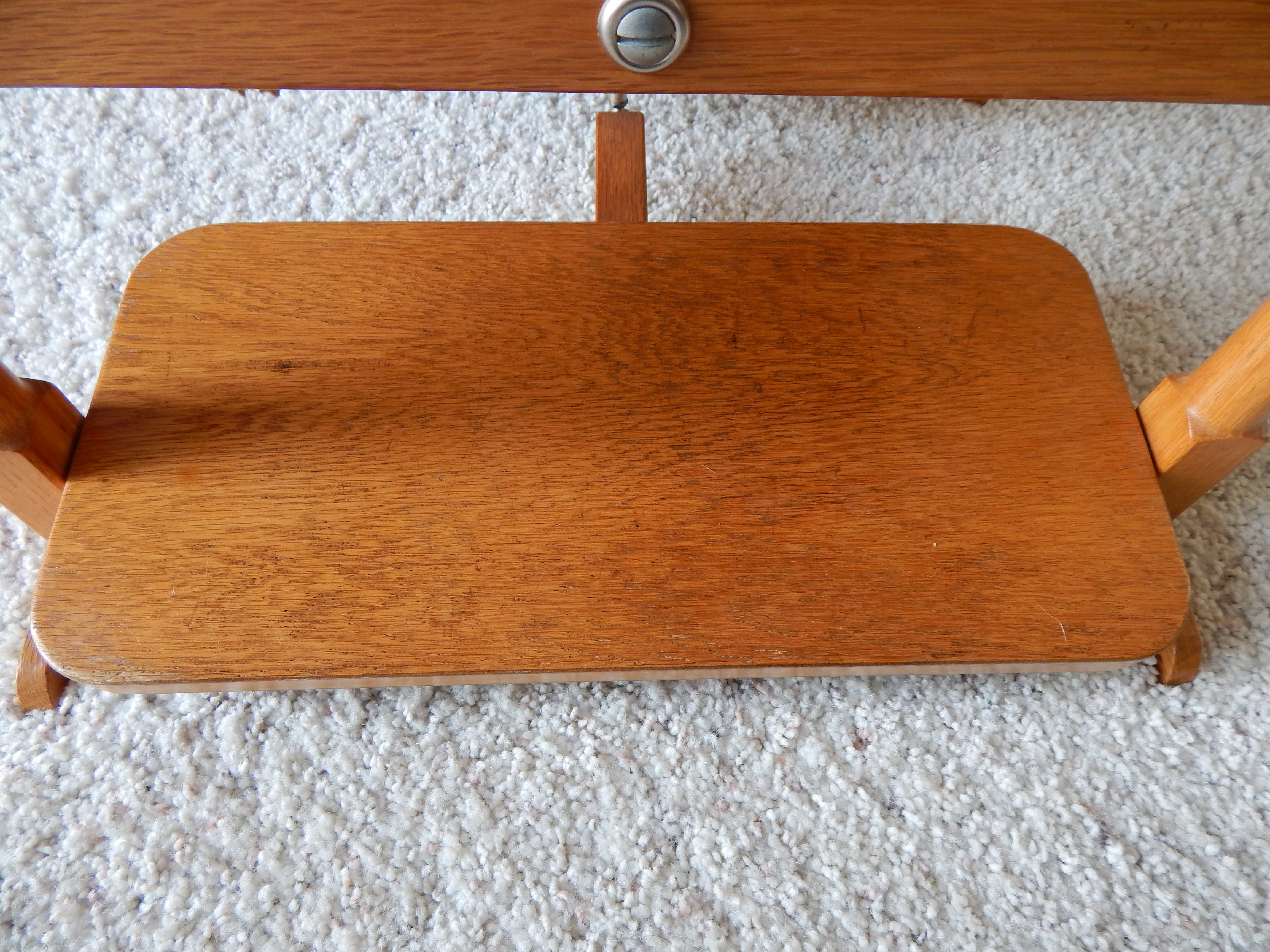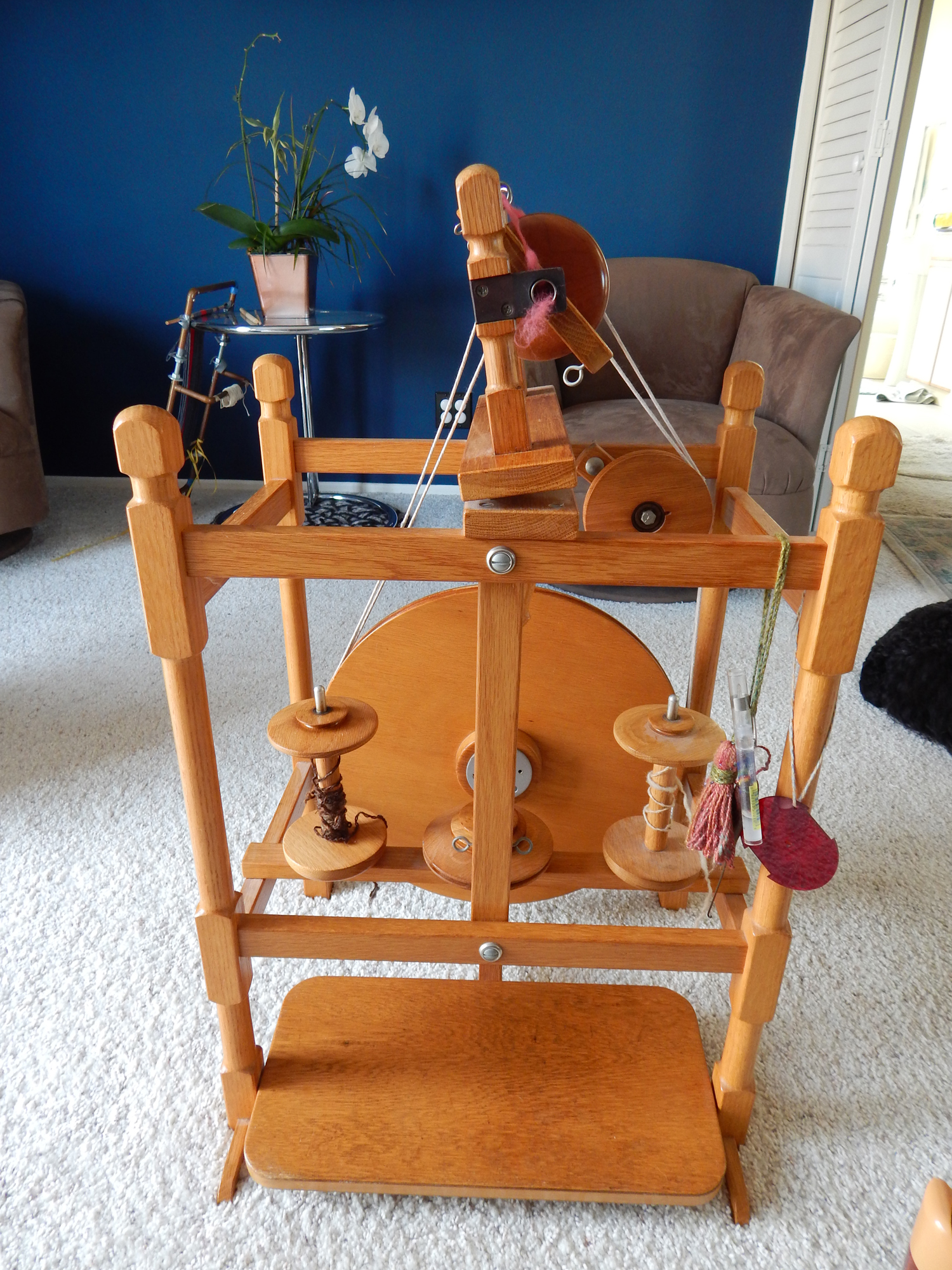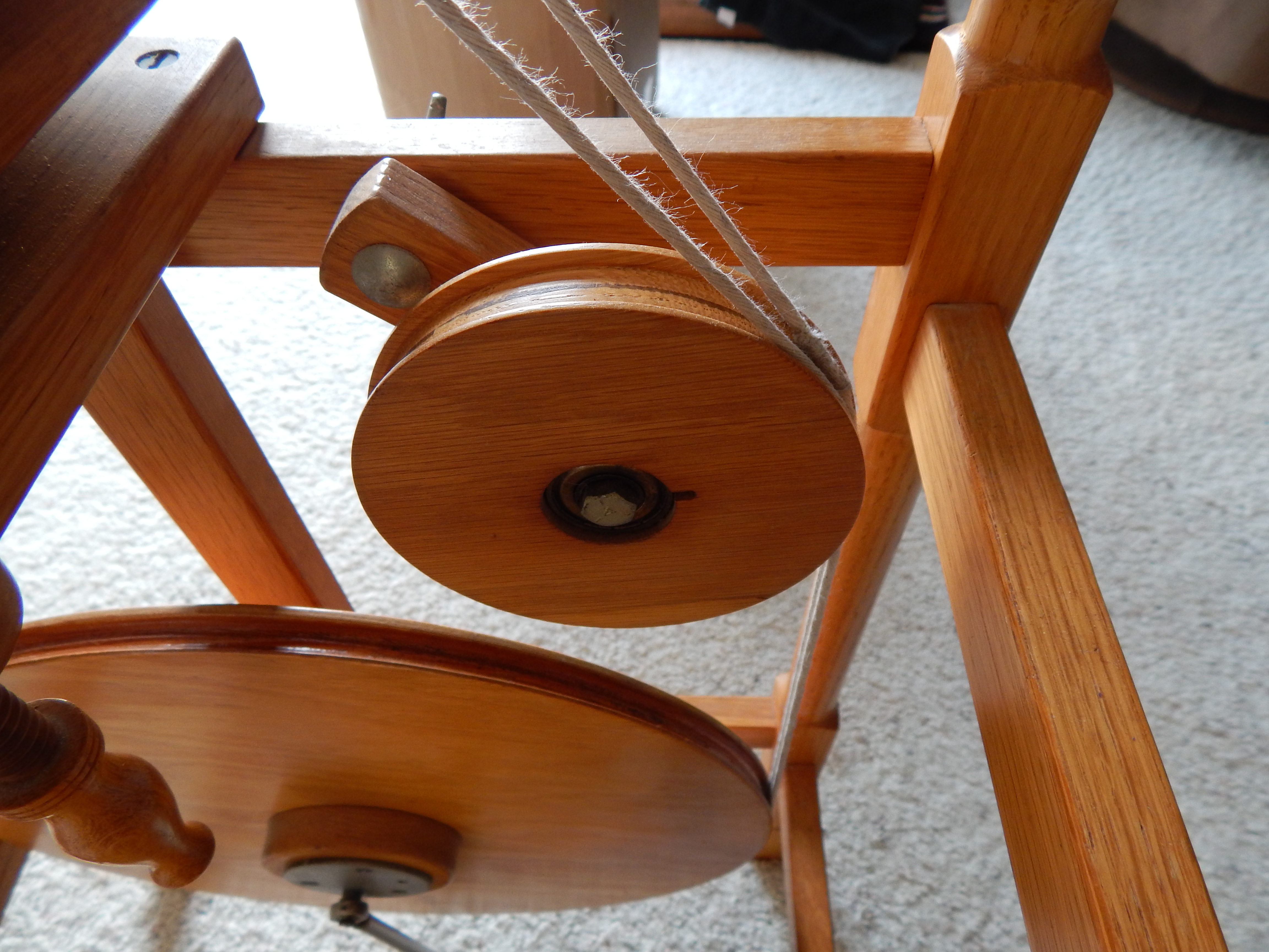 The wheel is well used and the bobbin is the only wood on the wheel showing wear. It is cosmetic. This extra wide treadle is for two feet. Ernest Mason what a chiropractor before he was a wheel maker and believed in good ergonomics before people even knew what that meant. |