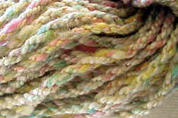 Preparation for Spinning: The noil was dyed with Easter egg dyes then blended with the Bombyx Mori on the drum carder. Reason for Choice of this Sample: This blend of silk was fun and exciting. The Bombyx gave strength and the noil interest. This aspect of the COE left room for design. |